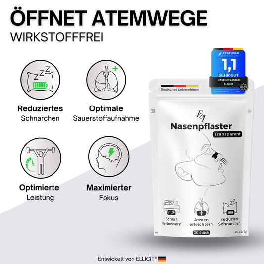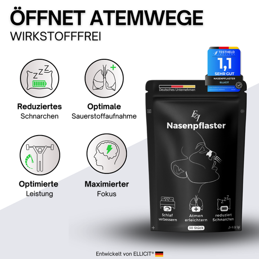 Die ELLICIT® Nasenpflaster sind wirkstoff- und rezeptfrei. Die Nasenflügel werden auf mechanische Weise von außen sanft geöffnet. Dadurch werden eventuelle Widerstände im Luftdurchlass verringert und das Atmen erleichtert. ELLICIT® kann immer dann verwendet werden, wenn Du beim Sport, im Schlaf oder zu beliebiger Tages- und Nachtzeit leichter durch die Nase atmen möchtest.